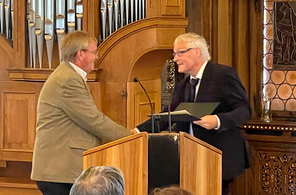 Aufgrund der coronabedingten Einschränkungen hatten die Preisverleihungen für die vergangenen zwei Jahre verschoben werden müssen, so dass erst jetzt, am 6.7.2022, im Bachsaal des Residenzschlosses Altenburg die feierliche Übergabe stattfinden konnte, zu der zahlreiche GAGO-Mitglieder, Kooperationspartner und Freunde anwesend waren. Den Festvortrag hielt Simon Ernst und beleuchtete darin die Vermessung des altenburgischen Teils des Herzogtums Sachsen-Gotha-Altenburg anno 1786/87. Das Foto (Aufnahme: Enrico Neunübel) zeigt den Schatzmeister der Historischen Kommission für Thüringen, Uwe Schirmer (Professor für Thüringische Landesgeschichte am Historischen Institut der Friedrich-Schiller-Universität Jena), der auch die Laudatio auf die GAGO hielt, bei der Übergabe der Preisurkunde an den GAGO-Vorsitzenden Gustav Wolf (links).